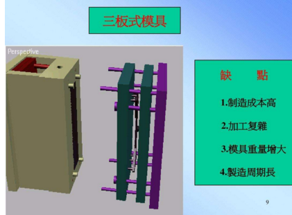 細(xì)水口模具又叫三板式模具,的流道及澆口不在分型線上,一般直接在產(chǎn)品上,所以我們在設(shè)計(jì)的時候多一組水口分模線,設(shè)計(jì)較為復(fù)雜,加工較困難,一般要視產(chǎn)品和客戶要求而選用細(xì)水口系統(tǒng)。這種模具的澆口位置選擇的地方比較多,而且開模時流道澆口與產(chǎn)品會自動分開,也省去了剪澆口這一步驟,被稱呼為三板式模具